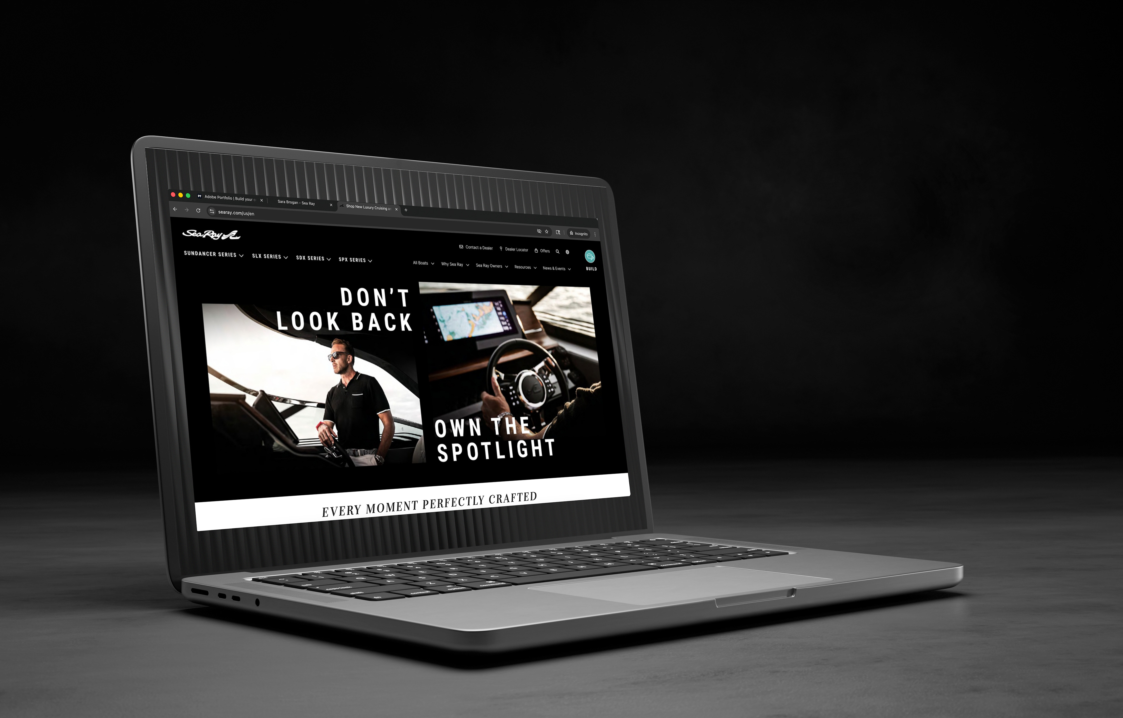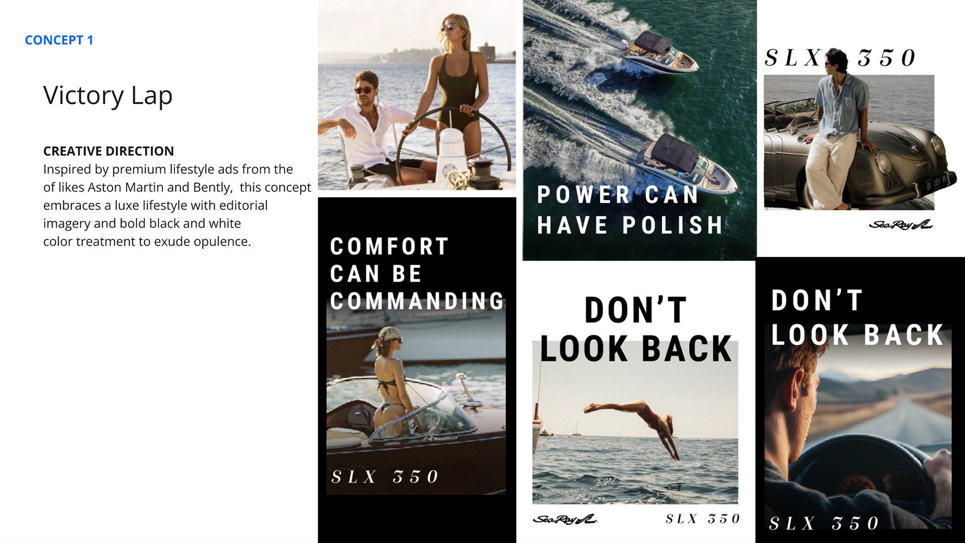 The Sea Ray SLX360 Outboard launch drew inspiration from the cinematic world of James Bond, a touchstone for the brand’s aspirational identity. For this model family, the customer is driven, accomplished, and sees the boat as an extension of their lifestyle and success. The campaign leaned into bold typography, dramatic cinematic angles, and luxurious finishes to reflect that sense of sophistication and power. I led the campaign from concept to execution, shaping the visual storytelling and directing every aspect of the photoshoot. From selecting talent, wardrobe, props, and locations to overseeing shot composition and art direction, I ensured every element reflected the brand’s vision and brought the campaign’s narrative to life.